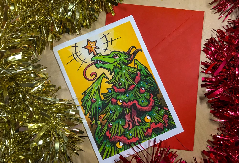 Disguised as a Christmas tree trying to get hold of all the golden stars people decorate their trees with, this dragon has a plan and wants to add your trimmings to its horde.