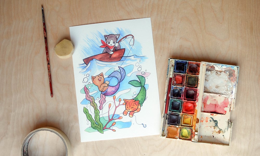 Based on an image from a children's book I am very fond of, I had to draw my cat mermaids being meanies to the poor fisher kitten and his boat. Really proud of how this picture came out, the sky at the top looks just right and the gleeful face of the mischief Purrmaid is perfect.