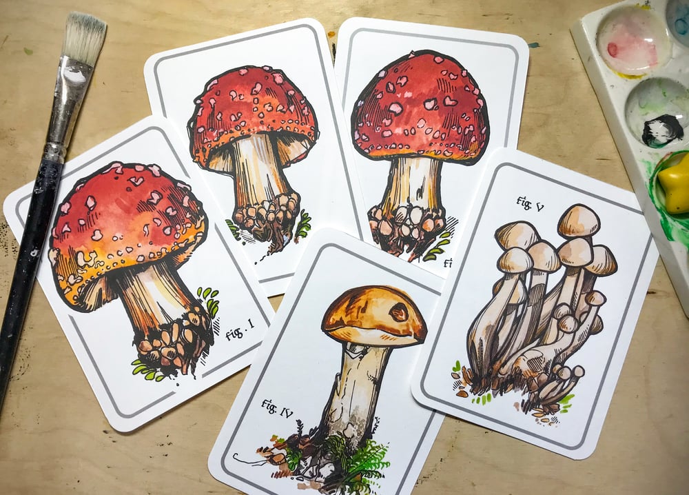 Inspired by recent rains and autumnal weather, drawings of mushrooms sprang up all over my desk. By popular request they can now be purchased as a set and used as pictures for the wall, note cards or even props for Larp.